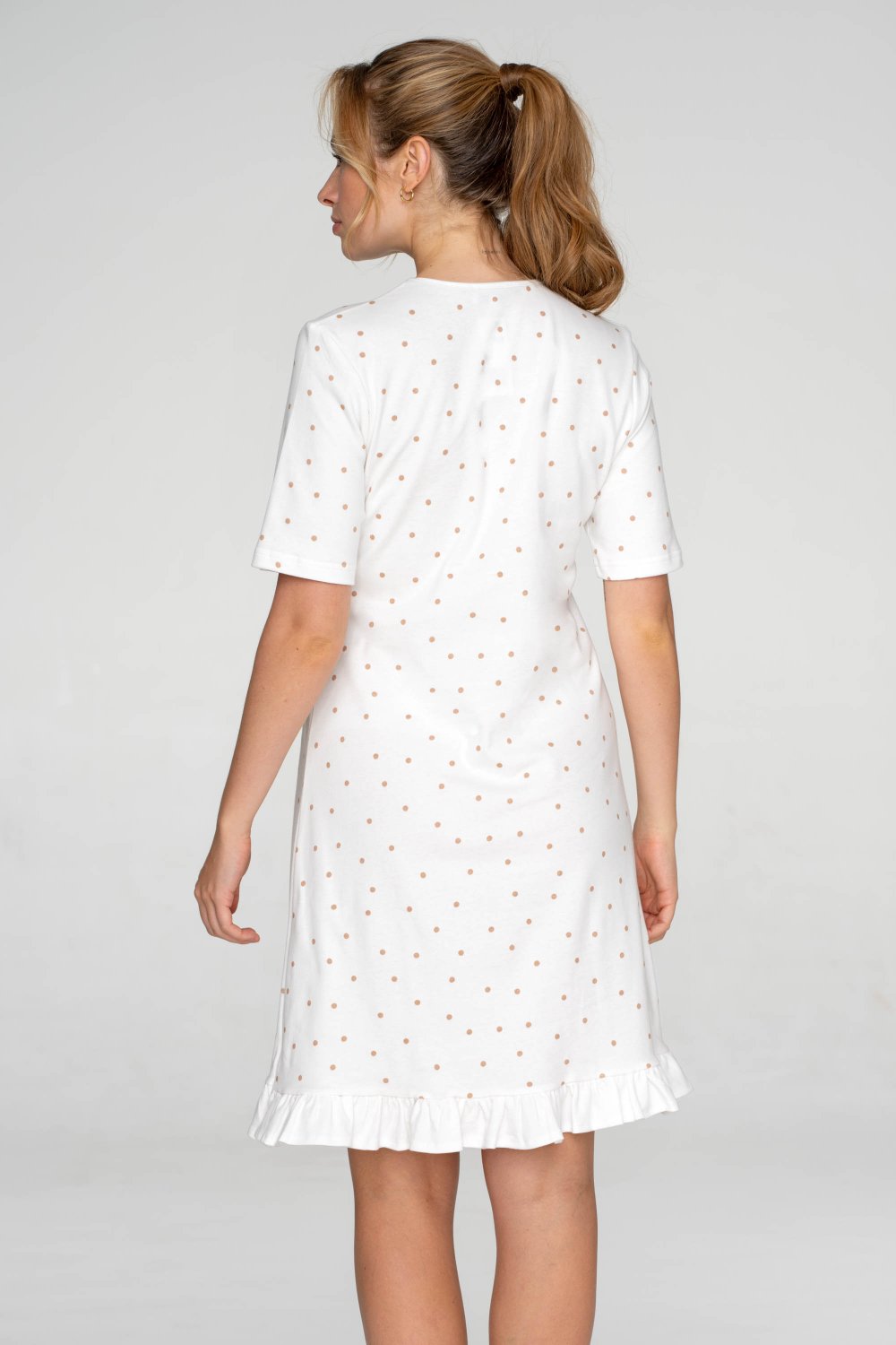 Vyzkoušejte jedinečné pohodlí s dámskou bavlněnou noční košilí z kolekce Beige Dots. Tato noční košile je vyrobena ze 100% kvalitní bavlny, mimořádně měkká, prodyšná a příjemná na těle. Jemný smetanový odstín košile je doplněn volánkem na spodním lemu a jemnými puntíky, což dodává košili elegantní a nadčasový vzhled. Košile má klasický střih s kulatým výstřihem a krátkými rukávy, ideální pro chladnější noci.