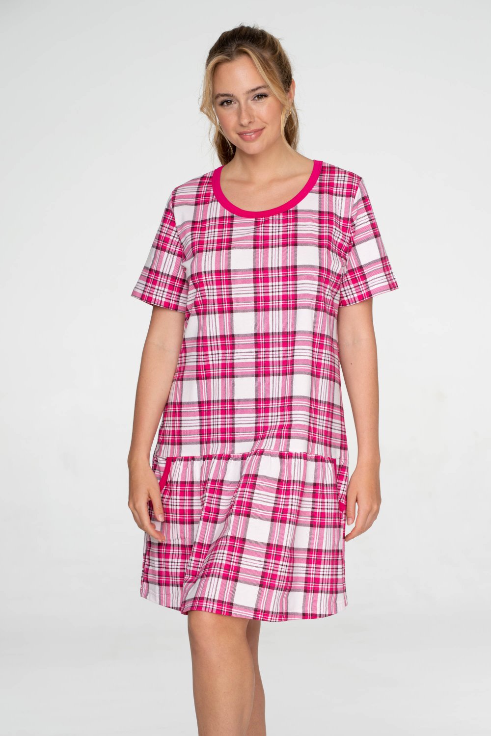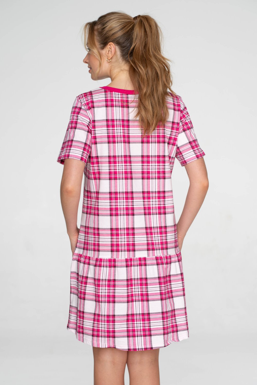Noční košile z kolekce Pink Cubes s kostkovaným vzorem a kombinací tmavě růžové a bílé barvy, které dělají noční košili velmi elegantní. Noční košile pod pasem přechází do volnější řasené sukně s kapsami, která tak tvoří hezkou ženskou figuru a tělu lichotí.