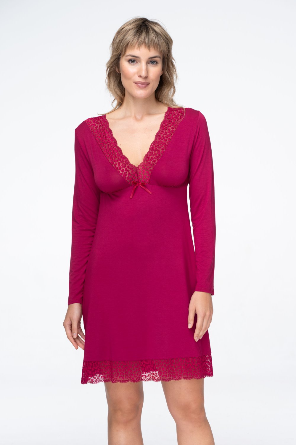 Noční košile nabízí svůdný výstřih do V, který je lemovaný jemnou italskou krajkou s dravým, zvířecím motivem. Krajka zdobí také spodní lem košile a dodává celku luxusní vzhled.