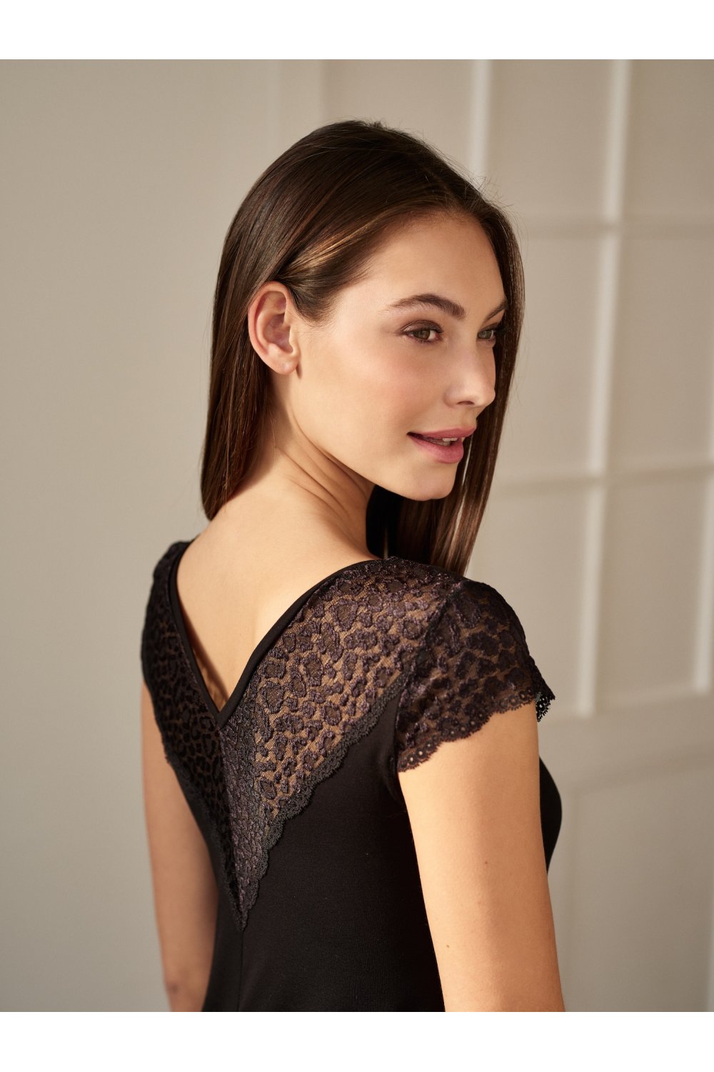 Horní partie zad zdobí široký pás italské krajky se zvířecím motivem, který plynule přechází do krátkých rukávků a vytváří lehký, vzdušný efekt. Krajka zde funguje jako výrazný designový prvek, který zvýrazňuje linii ramen a dodává košili jemnou eleganci.