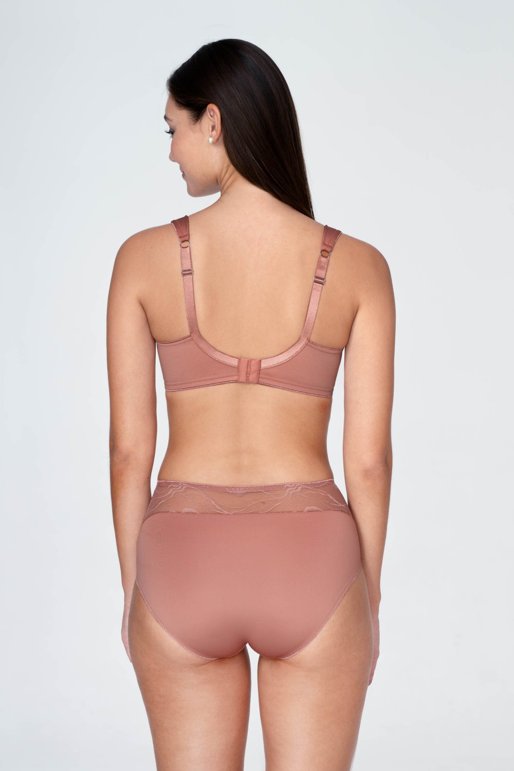 Nevyztužená šitá podprsenka z kolekce Flow je zpevněná kosticí a koše má zasazeny v sedýlku. Je vhodná pro menší a střední poprsí, ale díky zpevněnému zadnímu dílu udrží prsa do velikosti F. Ideální střih pro ženy, které vyhledávají klasickou eleganci v netradičním provedení.