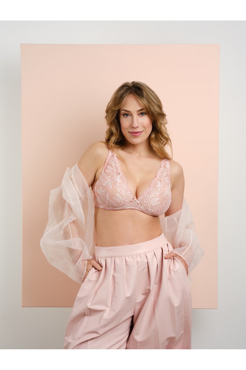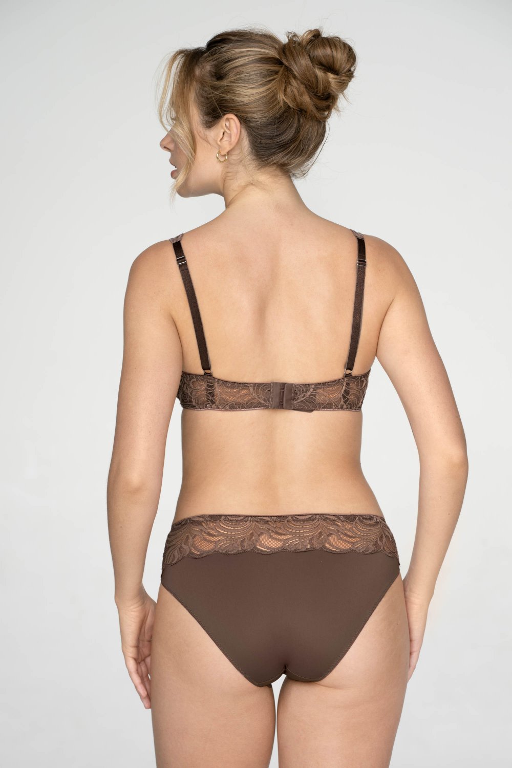 Delikátní starorůžová krajka je mistrovsky protkána druhým tónem v odstínu slonové kosti a vytváří tak elegantní, nadčasové spojení. Precizně zpracovaná hnědá krajka s organickými motivy nese jedinečný vypletený vzor exkluzivně pro tuto kolekci, a podtrhuje tak její výjimečný charakter.