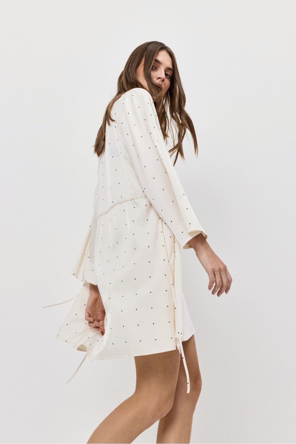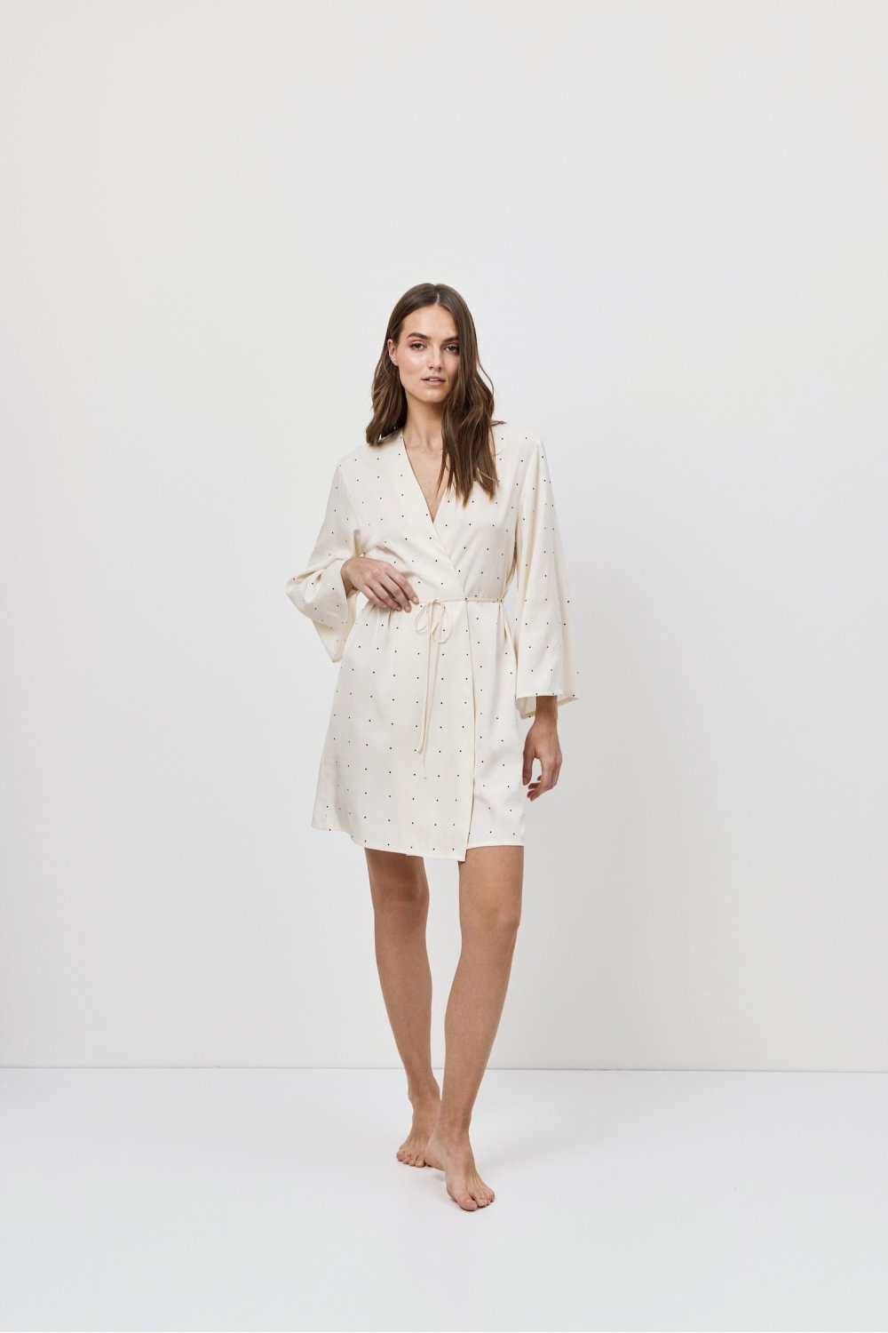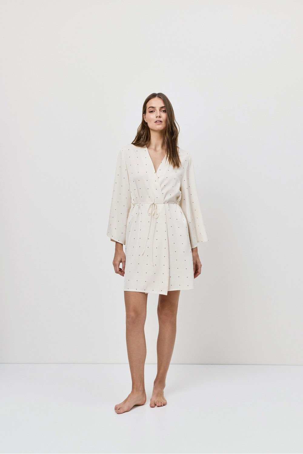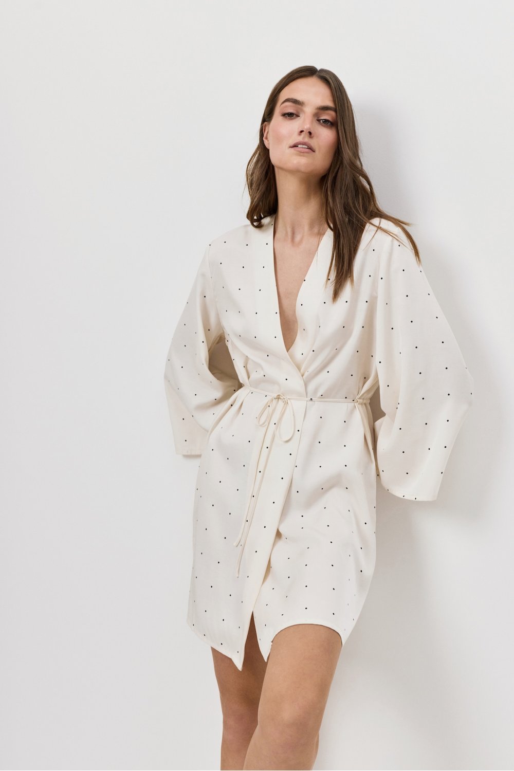 Lehký župánek s dlouhými rukávy a zavazováním v pase.