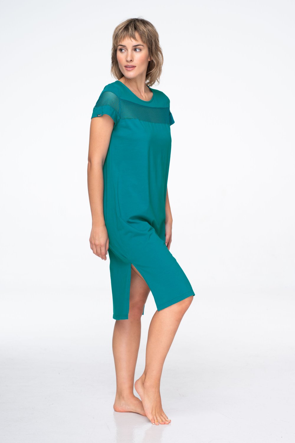 Okrúhly výstrih podčiarkuje jednoduchosť modelu a pristane každému typu postavy. Dĺžka ľahko pod kolená spolu s krátkym rukávom vytvára vyvážený, univerzálny strih vhodný do mesta aj na voľný čas.